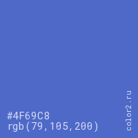 Цвет #4F69C8 в цветовой модели RGB обозначается тремя октетами (79, 105, 200) в десятичном формате и #4F69C8 в шестнадцатиричном (hex) формате, которые являются интенсивностью красного 79 (hex 4F), интенсивность зелёного 105 (hex 69) и интенсивность синего 200 (hex C8).