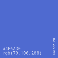 Цвет #4F6AD0 в цветовой модели RGB обозначается тремя октетами (79, 106, 208) в десятичном формате и #4F6AD0 в шестнадцатиричном (hex) формате, которые являются интенсивностью красного 79 (hex 4F), интенсивность зелёного 106 (hex 6A) и интенсивность синего 208 (hex D0).