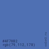 Цвет #4F70B2 в цветовой модели RGB обозначается тремя октетами (79, 112, 178) в десятичном формате и #4F70B2 в шестнадцатиричном (hex) формате, которые являются интенсивностью красного 79 (hex 4F), интенсивность зелёного 112 (hex 70) и интенсивность синего 178 (hex B2).
