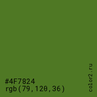 Цвет #4F7824 в цветовой модели RGB обозначается тремя октетами (79, 120, 36) в десятичном формате и #4F7824 в шестнадцатиричном (hex) формате, которые являются интенсивностью красного 79 (hex 4F), интенсивность зелёного 120 (hex 78) и интенсивность синего 36 (hex 24).