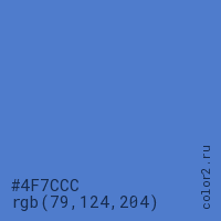 Цвет #4F7CCC в цветовой модели RGB обозначается тремя октетами (79, 124, 204) в десятичном формате и #4F7CCC в шестнадцатиричном (hex) формате, которые являются интенсивностью красного 79 (hex 4F), интенсивность зелёного 124 (hex 7C) и интенсивность синего 204 (hex CC).