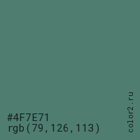Цвет #4F7E71 в цветовой модели RGB обозначается тремя октетами (79, 126, 113) в десятичном формате и #4F7E71 в шестнадцатиричном (hex) формате, которые являются интенсивностью красного 79 (hex 4F), интенсивность зелёного 126 (hex 7E) и интенсивность синего 113 (hex 71).
