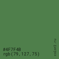 Цвет #4F7F4B в цветовой модели RGB обозначается тремя октетами (79, 127, 75) в десятичном формате и #4F7F4B в шестнадцатиричном (hex) формате, которые являются интенсивностью красного 79 (hex 4F), интенсивность зелёного 127 (hex 7F) и интенсивность синего 75 (hex 4B).