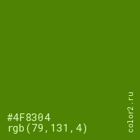 Цвет #4F8304 в цветовой модели RGB обозначается тремя октетами (79, 131, 4) в десятичном формате и #4F8304 в шестнадцатиричном (hex) формате, которые являются интенсивностью красного 79 (hex 4F), интенсивность зелёного 131 (hex 83) и интенсивность синего 4 (hex 04).