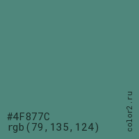 Цвет #4F877C в цветовой модели RGB обозначается тремя октетами (79, 135, 124) в десятичном формате и #4F877C в шестнадцатиричном (hex) формате, которые являются интенсивностью красного 79 (hex 4F), интенсивность зелёного 135 (hex 87) и интенсивность синего 124 (hex 7C).