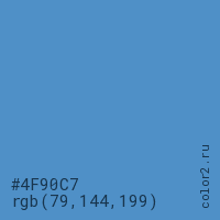 Цвет #4F90C7 в цветовой модели RGB обозначается тремя октетами (79, 144, 199) в десятичном формате и #4F90C7 в шестнадцатиричном (hex) формате, которые являются интенсивностью красного 79 (hex 4F), интенсивность зелёного 144 (hex 90) и интенсивность синего 199 (hex C7).