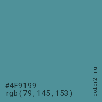 Цвет #4F9199 в цветовой модели RGB обозначается тремя октетами (79, 145, 153) в десятичном формате и #4F9199 в шестнадцатиричном (hex) формате, которые являются интенсивностью красного 79 (hex 4F), интенсивность зелёного 145 (hex 91) и интенсивность синего 153 (hex 99).
