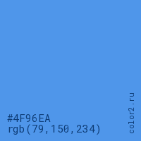 Цвет #4F96EA в цветовой модели RGB обозначается тремя октетами (79, 150, 234) в десятичном формате и #4F96EA в шестнадцатиричном (hex) формате, которые являются интенсивностью красного 79 (hex 4F), интенсивность зелёного 150 (hex 96) и интенсивность синего 234 (hex EA).