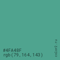 Цвет #4FA48F в цветовой модели RGB обозначается тремя октетами (79, 164, 143) в десятичном формате и #4FA48F в шестнадцатиричном (hex) формате, которые являются интенсивностью красного 79 (hex 4F), интенсивность зелёного 164 (hex A4) и интенсивность синего 143 (hex 8F).