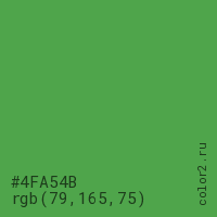 Цвет #4FA54B в цветовой модели RGB обозначается тремя октетами (79, 165, 75) в десятичном формате и #4FA54B в шестнадцатиричном (hex) формате, которые являются интенсивностью красного 79 (hex 4F), интенсивность зелёного 165 (hex A5) и интенсивность синего 75 (hex 4B).