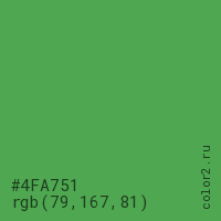Цвет #4FA751 в цветовой модели RGB обозначается тремя октетами (79, 167, 81) в десятичном формате и #4FA751 в шестнадцатиричном (hex) формате, которые являются интенсивностью красного 79 (hex 4F), интенсивность зелёного 167 (hex A7) и интенсивность синего 81 (hex 51).