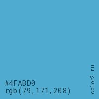 Цвет #4FABD0 в цветовой модели RGB обозначается тремя октетами (79, 171, 208) в десятичном формате и #4FABD0 в шестнадцатиричном (hex) формате, которые являются интенсивностью красного 79 (hex 4F), интенсивность зелёного 171 (hex AB) и интенсивность синего 208 (hex D0).