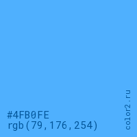 Цвет #4FB0FE в цветовой модели RGB обозначается тремя октетами (79, 176, 254) в десятичном формате и #4FB0FE в шестнадцатиричном (hex) формате, которые являются интенсивностью красного 79 (hex 4F), интенсивность зелёного 176 (hex B0) и интенсивность синего 254 (hex FE).