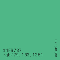Цвет #4FB787 в цветовой модели RGB обозначается тремя октетами (79, 183, 135) в десятичном формате и #4FB787 в шестнадцатиричном (hex) формате, которые являются интенсивностью красного 79 (hex 4F), интенсивность зелёного 183 (hex B7) и интенсивность синего 135 (hex 87).