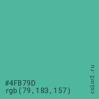 Цвет #4FB79D в цветовой модели RGB обозначается тремя октетами (79, 183, 157) в десятичном формате и #4FB79D в шестнадцатиричном (hex) формате, которые являются интенсивностью красного 79 (hex 4F), интенсивность зелёного 183 (hex B7) и интенсивность синего 157 (hex 9D).