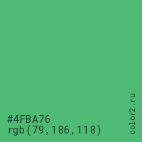 Цвет #4FBA76 в цветовой модели RGB обозначается тремя октетами (79, 186, 118) в десятичном формате и #4FBA76 в шестнадцатиричном (hex) формате, которые являются интенсивностью красного 79 (hex 4F), интенсивность зелёного 186 (hex BA) и интенсивность синего 118 (hex 76).