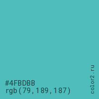 Цвет #4FBDBB в цветовой модели RGB обозначается тремя октетами (79, 189, 187) в десятичном формате и #4FBDBB в шестнадцатиричном (hex) формате, которые являются интенсивностью красного 79 (hex 4F), интенсивность зелёного 189 (hex BD) и интенсивность синего 187 (hex BB).
