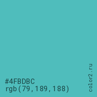 Цвет #4FBDBC в цветовой модели RGB обозначается тремя октетами (79, 189, 188) в десятичном формате и #4FBDBC в шестнадцатиричном (hex) формате, которые являются интенсивностью красного 79 (hex 4F), интенсивность зелёного 189 (hex BD) и интенсивность синего 188 (hex BC).