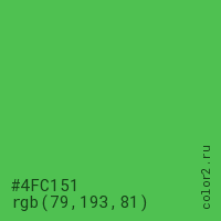 Цвет #4FC151 в цветовой модели RGB обозначается тремя октетами (79, 193, 81) в десятичном формате и #4FC151 в шестнадцатиричном (hex) формате, которые являются интенсивностью красного 79 (hex 4F), интенсивность зелёного 193 (hex C1) и интенсивность синего 81 (hex 51).