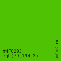 Цвет #4FC203 в цветовой модели RGB обозначается тремя октетами (79, 194, 3) в десятичном формате и #4FC203 в шестнадцатиричном (hex) формате, которые являются интенсивностью красного 79 (hex 4F), интенсивность зелёного 194 (hex C2) и интенсивность синего 3 (hex 03).