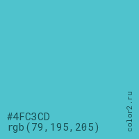 Цвет #4FC3CD в цветовой модели RGB обозначается тремя октетами (79, 195, 205) в десятичном формате и #4FC3CD в шестнадцатиричном (hex) формате, которые являются интенсивностью красного 79 (hex 4F), интенсивность зелёного 195 (hex C3) и интенсивность синего 205 (hex CD).