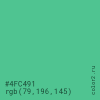 Цвет #4FC491 в цветовой модели RGB обозначается тремя октетами (79, 196, 145) в десятичном формате и #4FC491 в шестнадцатиричном (hex) формате, которые являются интенсивностью красного 79 (hex 4F), интенсивность зелёного 196 (hex C4) и интенсивность синего 145 (hex 91).