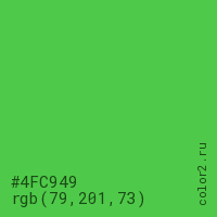 Цвет #4FC949 в цветовой модели RGB обозначается тремя октетами (79, 201, 73) в десятичном формате и #4FC949 в шестнадцатиричном (hex) формате, которые являются интенсивностью красного 79 (hex 4F), интенсивность зелёного 201 (hex C9) и интенсивность синего 73 (hex 49).