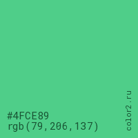 Цвет #4FCE89 в цветовой модели RGB обозначается тремя октетами (79, 206, 137) в десятичном формате и #4FCE89 в шестнадцатиричном (hex) формате, которые являются интенсивностью красного 79 (hex 4F), интенсивность зелёного 206 (hex CE) и интенсивность синего 137 (hex 89).