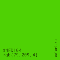 Цвет #4FD104 в цветовой модели RGB обозначается тремя октетами (79, 209, 4) в десятичном формате и #4FD104 в шестнадцатиричном (hex) формате, которые являются интенсивностью красного 79 (hex 4F), интенсивность зелёного 209 (hex D1) и интенсивность синего 4 (hex 04).