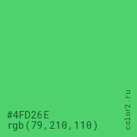 Цвет #4FD26E в цветовой модели RGB обозначается тремя октетами (79, 210, 110) в десятичном формате и #4FD26E в шестнадцатиричном (hex) формате, которые являются интенсивностью красного 79 (hex 4F), интенсивность зелёного 210 (hex D2) и интенсивность синего 110 (hex 6E).