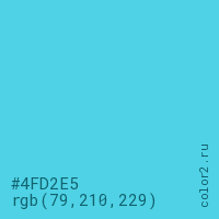 Цвет #4FD2E5 в цветовой модели RGB обозначается тремя октетами (79, 210, 229) в десятичном формате и #4FD2E5 в шестнадцатиричном (hex) формате, которые являются интенсивностью красного 79 (hex 4F), интенсивность зелёного 210 (hex D2) и интенсивность синего 229 (hex E5).