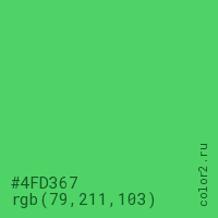 Цвет #4FD367 в цветовой модели RGB обозначается тремя октетами (79, 211, 103) в десятичном формате и #4FD367 в шестнадцатиричном (hex) формате, которые являются интенсивностью красного 79 (hex 4F), интенсивность зелёного 211 (hex D3) и интенсивность синего 103 (hex 67).