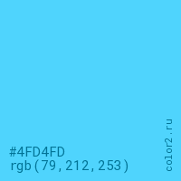 Цвет #4FD4FD в цветовой модели RGB обозначается тремя октетами (79, 212, 253) в десятичном формате и #4FD4FD в шестнадцатиричном (hex) формате, которые являются интенсивностью красного 79 (hex 4F), интенсивность зелёного 212 (hex D4) и интенсивность синего 253 (hex FD).
