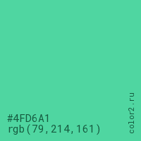 Цвет #4FD6A1 в цветовой модели RGB обозначается тремя октетами (79, 214, 161) в десятичном формате и #4FD6A1 в шестнадцатиричном (hex) формате, которые являются интенсивностью красного 79 (hex 4F), интенсивность зелёного 214 (hex D6) и интенсивность синего 161 (hex A1).