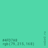 Цвет #4FD7A8 в цветовой модели RGB обозначается тремя октетами (79, 215, 168) в десятичном формате и #4FD7A8 в шестнадцатиричном (hex) формате, которые являются интенсивностью красного 79 (hex 4F), интенсивность зелёного 215 (hex D7) и интенсивность синего 168 (hex A8).