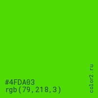 Цвет #4FDA03 в цветовой модели RGB обозначается тремя октетами (79, 218, 3) в десятичном формате и #4FDA03 в шестнадцатиричном (hex) формате, которые являются интенсивностью красного 79 (hex 4F), интенсивность зелёного 218 (hex DA) и интенсивность синего 3 (hex 03).
