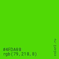 Цвет #4FDA08 в цветовой модели RGB обозначается тремя октетами (79, 218, 8) в десятичном формате и #4FDA08 в шестнадцатиричном (hex) формате, которые являются интенсивностью красного 79 (hex 4F), интенсивность зелёного 218 (hex DA) и интенсивность синего 8 (hex 08).