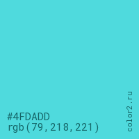 Цвет #4FDADD в цветовой модели RGB обозначается тремя октетами (79, 218, 221) в десятичном формате и #4FDADD в шестнадцатиричном (hex) формате, которые являются интенсивностью красного 79 (hex 4F), интенсивность зелёного 218 (hex DA) и интенсивность синего 221 (hex DD).