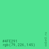 Цвет #4FE291 в цветовой модели RGB обозначается тремя октетами (79, 226, 145) в десятичном формате и #4FE291 в шестнадцатиричном (hex) формате, которые являются интенсивностью красного 79 (hex 4F), интенсивность зелёного 226 (hex E2) и интенсивность синего 145 (hex 91).