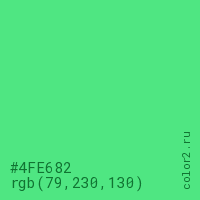 Цвет #4FE682 в цветовой модели RGB обозначается тремя октетами (79, 230, 130) в десятичном формате и #4FE682 в шестнадцатиричном (hex) формате, которые являются интенсивностью красного 79 (hex 4F), интенсивность зелёного 230 (hex E6) и интенсивность синего 130 (hex 82).