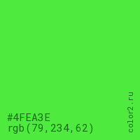 Цвет #4FEA3E в цветовой модели RGB обозначается тремя октетами (79, 234, 62) в десятичном формате и #4FEA3E в шестнадцатиричном (hex) формате, которые являются интенсивностью красного 79 (hex 4F), интенсивность зелёного 234 (hex EA) и интенсивность синего 62 (hex 3E).