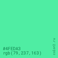 Цвет #4FEDA3 в цветовой модели RGB обозначается тремя октетами (79, 237, 163) в десятичном формате и #4FEDA3 в шестнадцатиричном (hex) формате, которые являются интенсивностью красного 79 (hex 4F), интенсивность зелёного 237 (hex ED) и интенсивность синего 163 (hex A3).