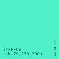 Цвет #4FEFC8 в цветовой модели RGB обозначается тремя октетами (79, 239, 200) в десятичном формате и #4FEFC8 в шестнадцатиричном (hex) формате, которые являются интенсивностью красного 79 (hex 4F), интенсивность зелёного 239 (hex EF) и интенсивность синего 200 (hex C8).
