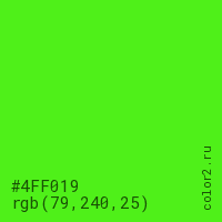 Цвет #4FF019 в цветовой модели RGB обозначается тремя октетами (79, 240, 25) в десятичном формате и #4FF019 в шестнадцатиричном (hex) формате, которые являются интенсивностью красного 79 (hex 4F), интенсивность зелёного 240 (hex F0) и интенсивность синего 25 (hex 19).