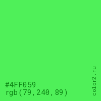 Цвет #4FF059 в цветовой модели RGB обозначается тремя октетами (79, 240, 89) в десятичном формате и #4FF059 в шестнадцатиричном (hex) формате, которые являются интенсивностью красного 79 (hex 4F), интенсивность зелёного 240 (hex F0) и интенсивность синего 89 (hex 59).