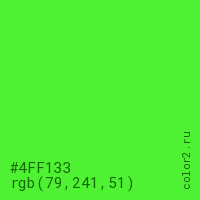 Цвет #4FF133 в цветовой модели RGB обозначается тремя октетами (79, 241, 51) в десятичном формате и #4FF133 в шестнадцатиричном (hex) формате, которые являются интенсивностью красного 79 (hex 4F), интенсивность зелёного 241 (hex F1) и интенсивность синего 51 (hex 33).
