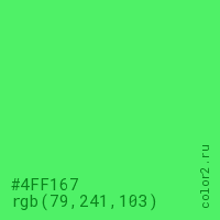 Цвет #4FF167 в цветовой модели RGB обозначается тремя октетами (79, 241, 103) в десятичном формате и #4FF167 в шестнадцатиричном (hex) формате, которые являются интенсивностью красного 79 (hex 4F), интенсивность зелёного 241 (hex F1) и интенсивность синего 103 (hex 67).