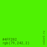 Цвет #4FF202 в цветовой модели RGB обозначается тремя октетами (79, 242, 2) в десятичном формате и #4FF202 в шестнадцатиричном (hex) формате, которые являются интенсивностью красного 79 (hex 4F), интенсивность зелёного 242 (hex F2) и интенсивность синего 2 (hex 02).
