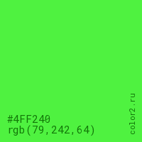 Цвет #4FF240 в цветовой модели RGB обозначается тремя октетами (79, 242, 64) в десятичном формате и #4FF240 в шестнадцатиричном (hex) формате, которые являются интенсивностью красного 79 (hex 4F), интенсивность зелёного 242 (hex F2) и интенсивность синего 64 (hex 40).
