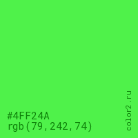 Цвет #4FF24A в цветовой модели RGB обозначается тремя октетами (79, 242, 74) в десятичном формате и #4FF24A в шестнадцатиричном (hex) формате, которые являются интенсивностью красного 79 (hex 4F), интенсивность зелёного 242 (hex F2) и интенсивность синего 74 (hex 4A).